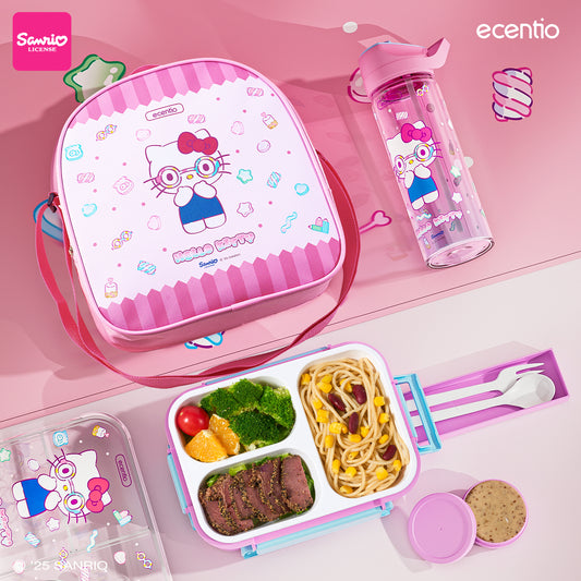 【Hello Kitty Series】ecentio Set Kotak Makan Lucu Hello Kitty 3 Bagian & Gelas Air Siswa dengan Kotak Saus 60ml Bawaan Peralatan Makan dan Tas Makan