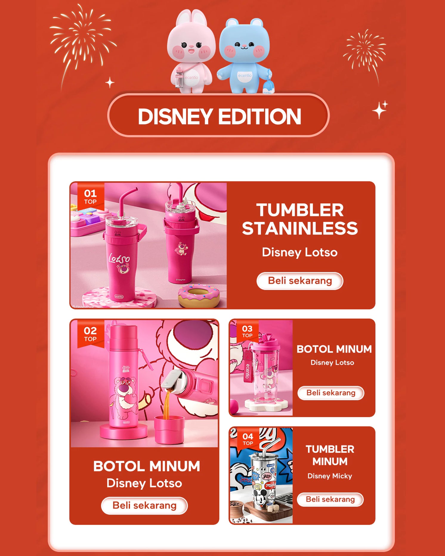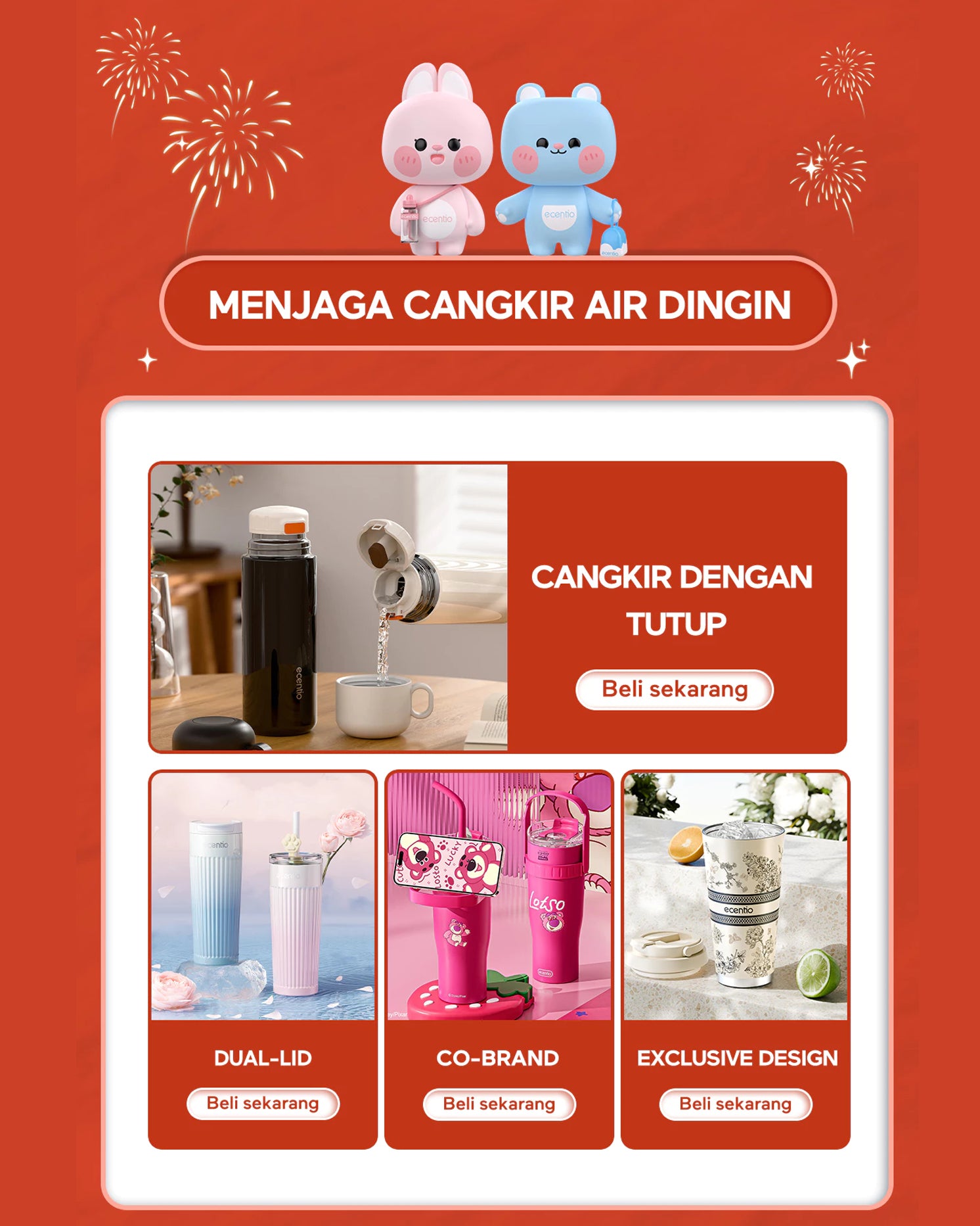 Pilih gaya Anda dengan Seri Botol Air ecentio yang khas. Dengan desain unik, termasuk kolaborasi dengan merek terkenal seperti Disney, Coca-Cola, dan desain khusus untuk bulan puasa. Dari rumah hingga kantor atau aktivitas luar ruangan, kami memiliki botol air yang cocok untuk Anda agar selalu terhidrasi dengan segar.