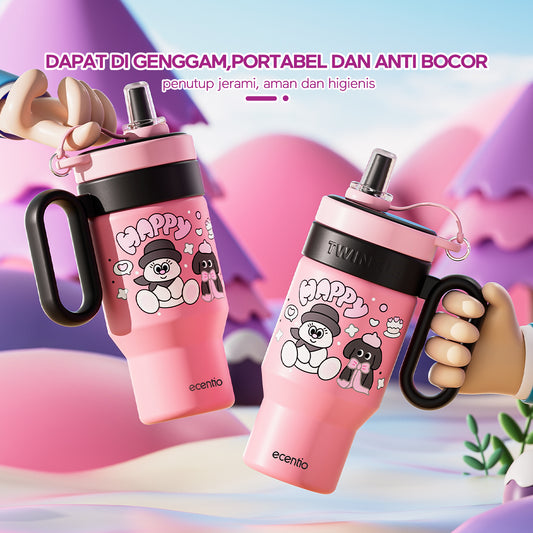 【New Launch】ecentio tumbler minum stainless 900ml botol minum lucu aesthetic besar exclusive disgn tutup sedotan tahan debu
