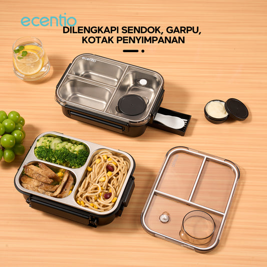 【2.0 anti tumpah】ecentio lunch box stainless 800ml sekat 3 dengan sendok sumpit free kotak sauce kecil
