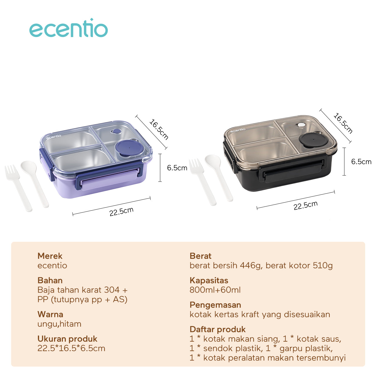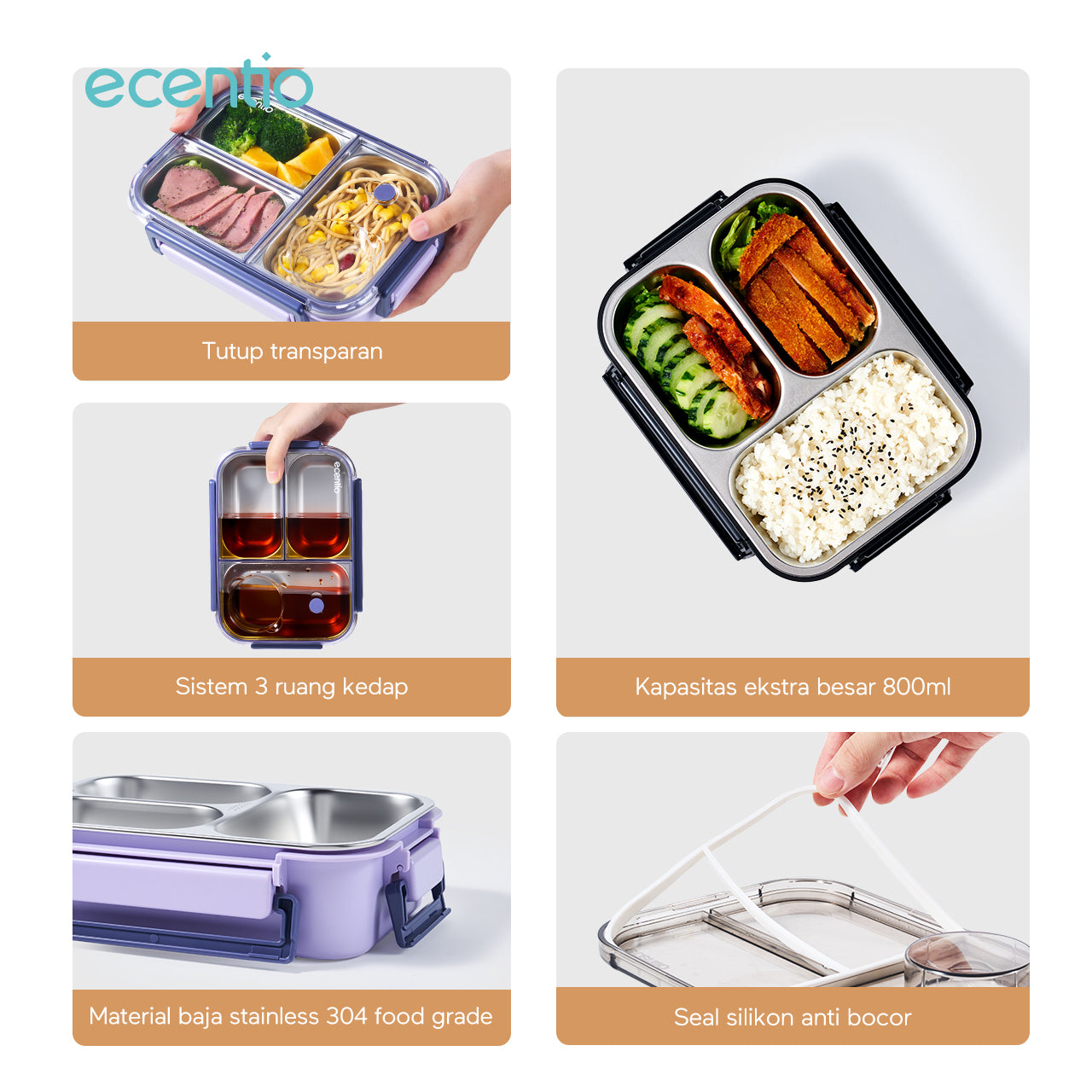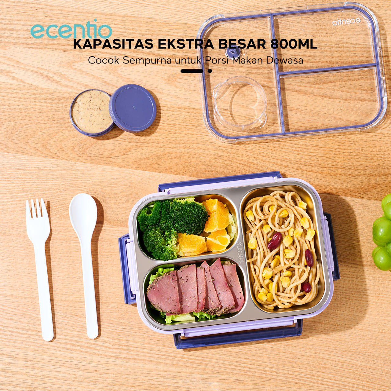 Nama Produk: ecentio Lunch Box Stainless 3 Sekat 800ml (Anti Bocor 2.0 – Warna Ungu)