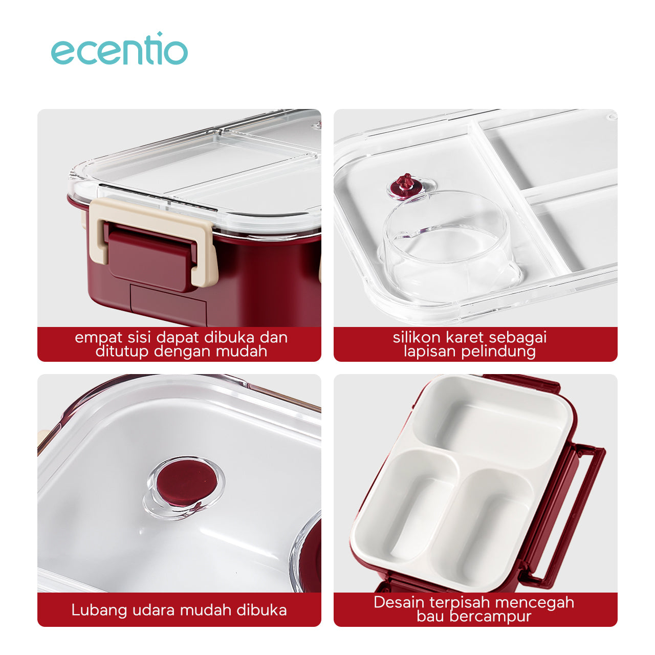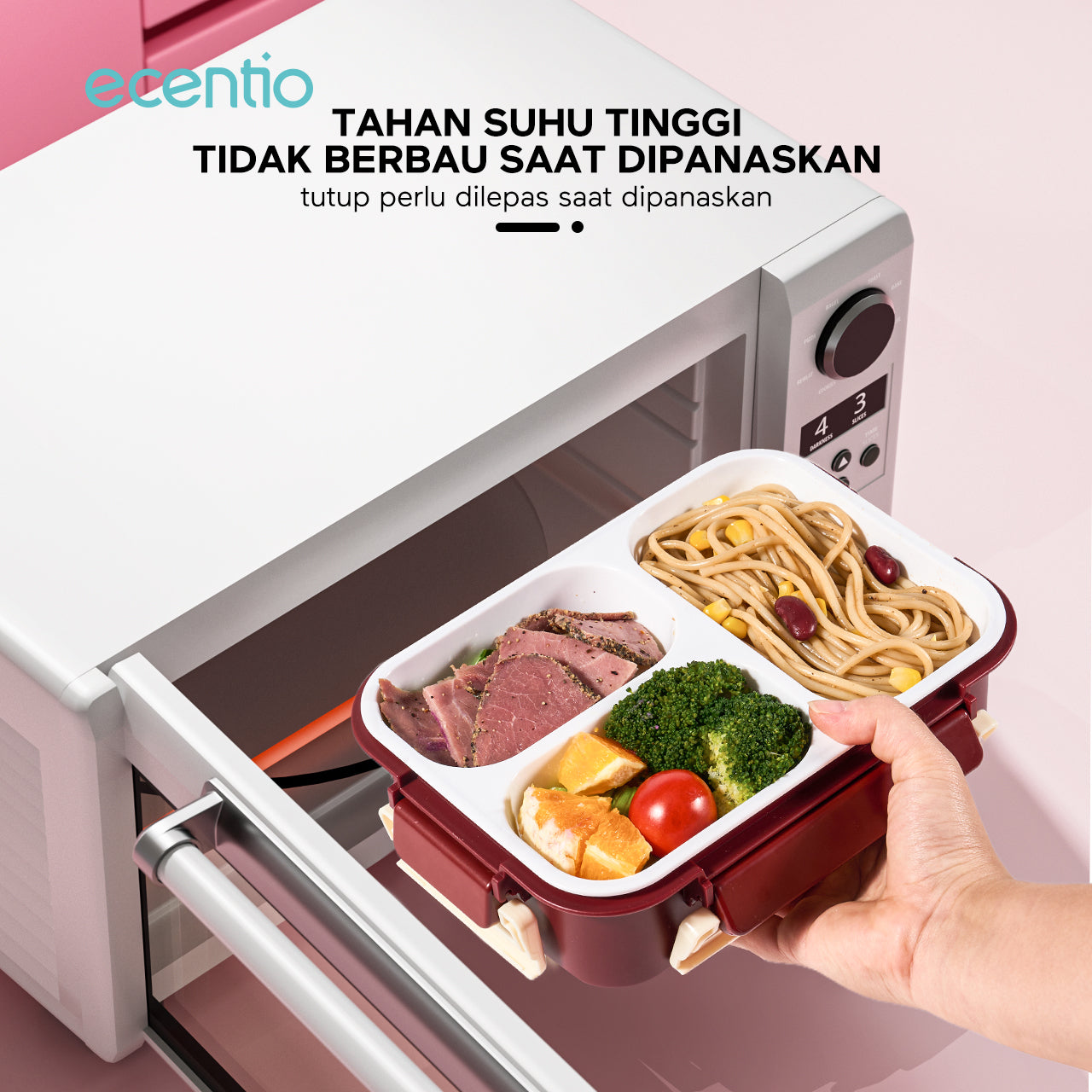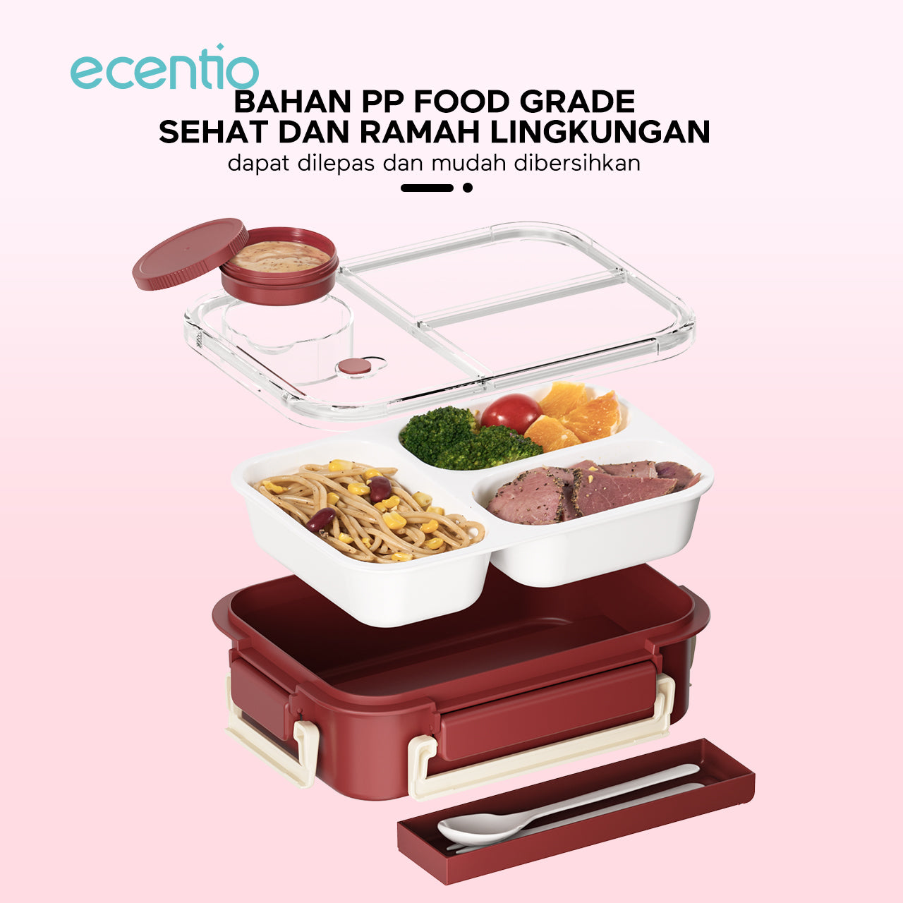 ecentio lining anti-smell plastic lunch box Desain tiga grid Sealing anti bocor kotak hidangan Merah 800ml