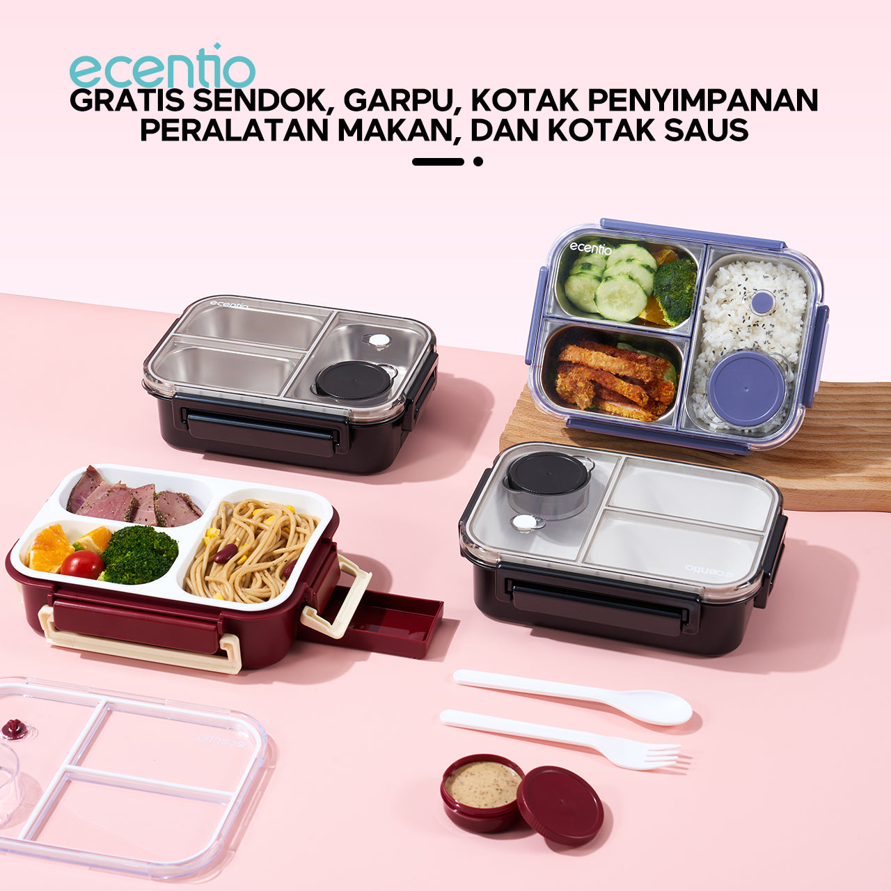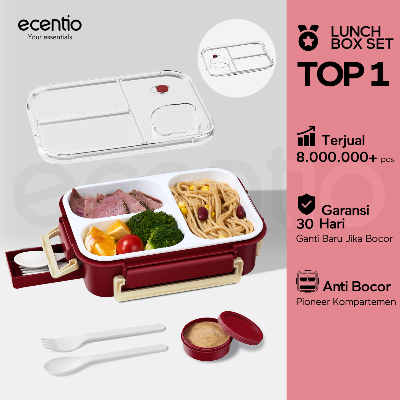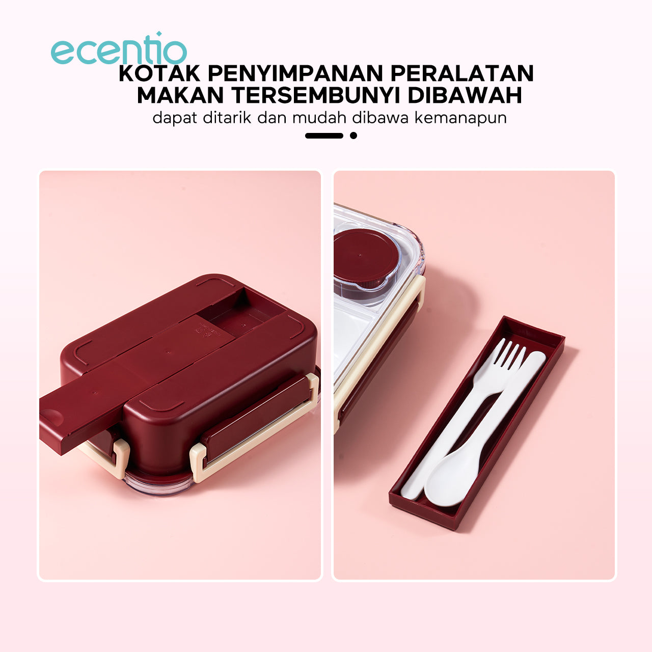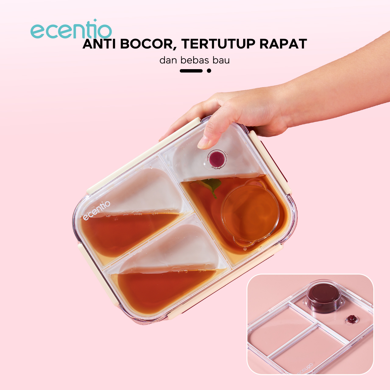 ecentio lining anti-smell plastic lunch box Desain tiga grid Sealing anti bocor kotak hidangan Merah 800ml