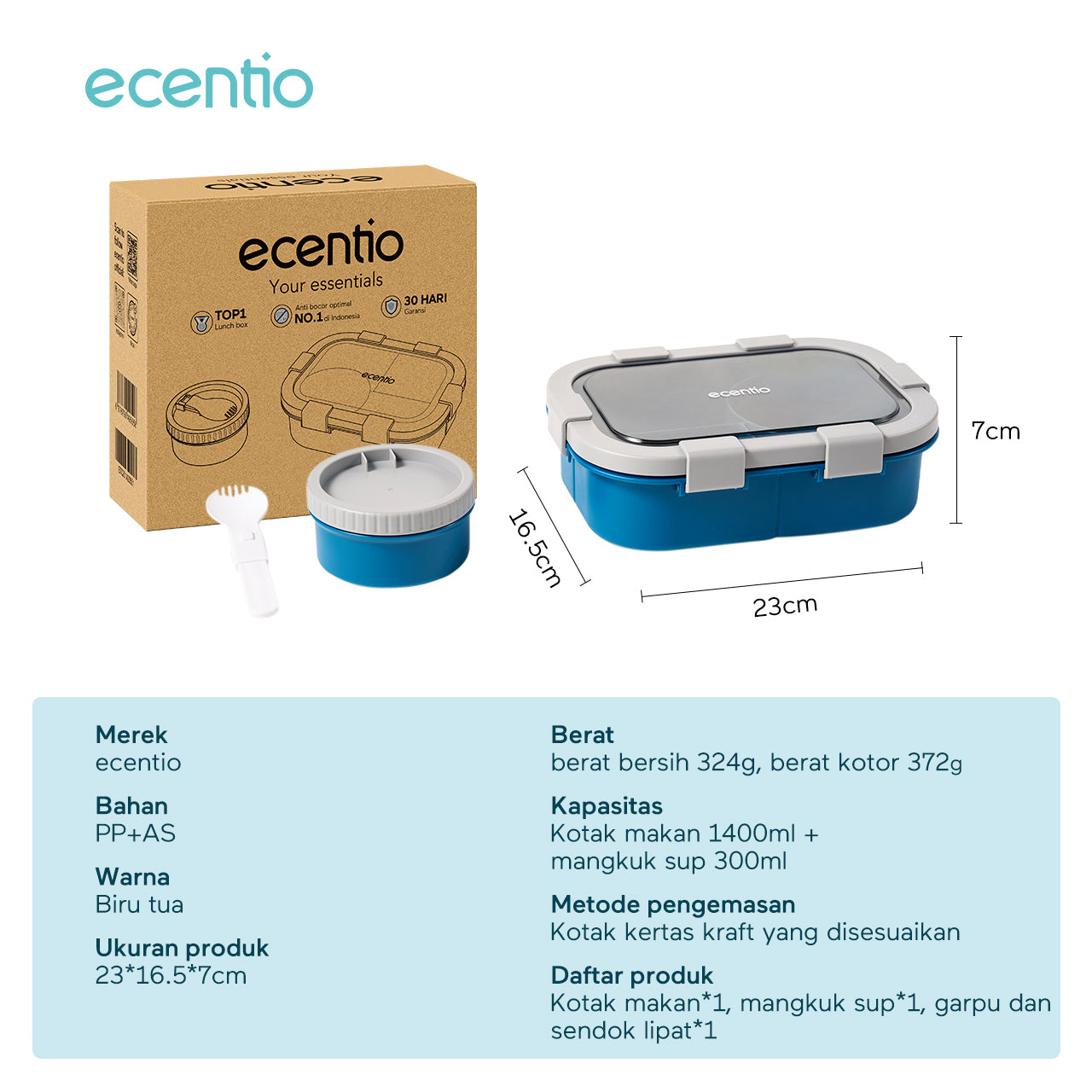 Kapasitas: Kotak makan 1400ml + mangkuk sup 300ml