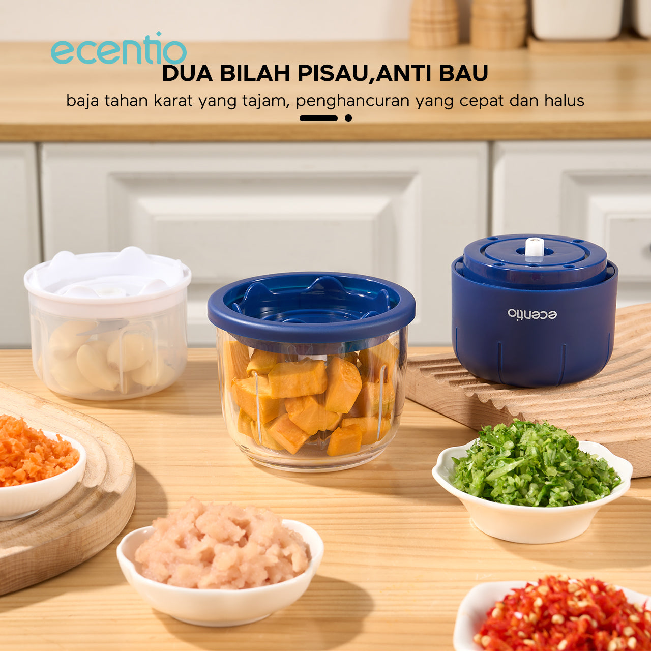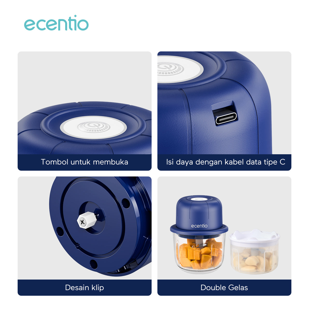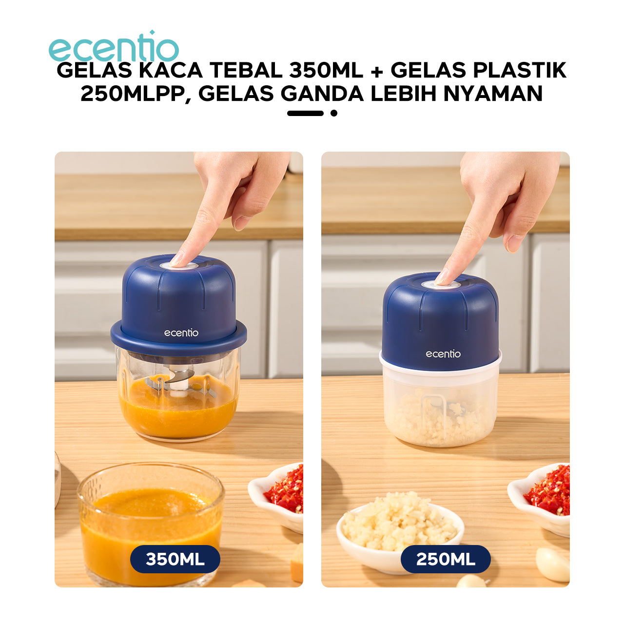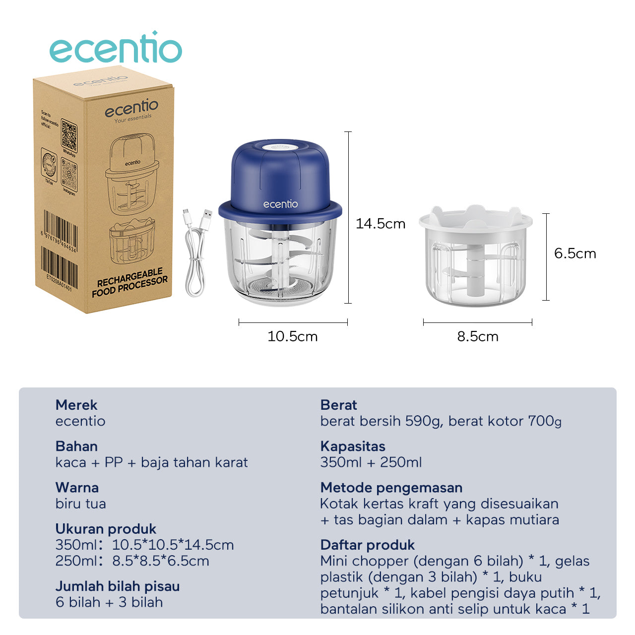Nama Produk: Mini Chopper Blender ecentio 3 in 1 multifungsi (6 bilah pisau gelas kaca 350ml + 3 bilah pisau gelas plastik 250mlpp)