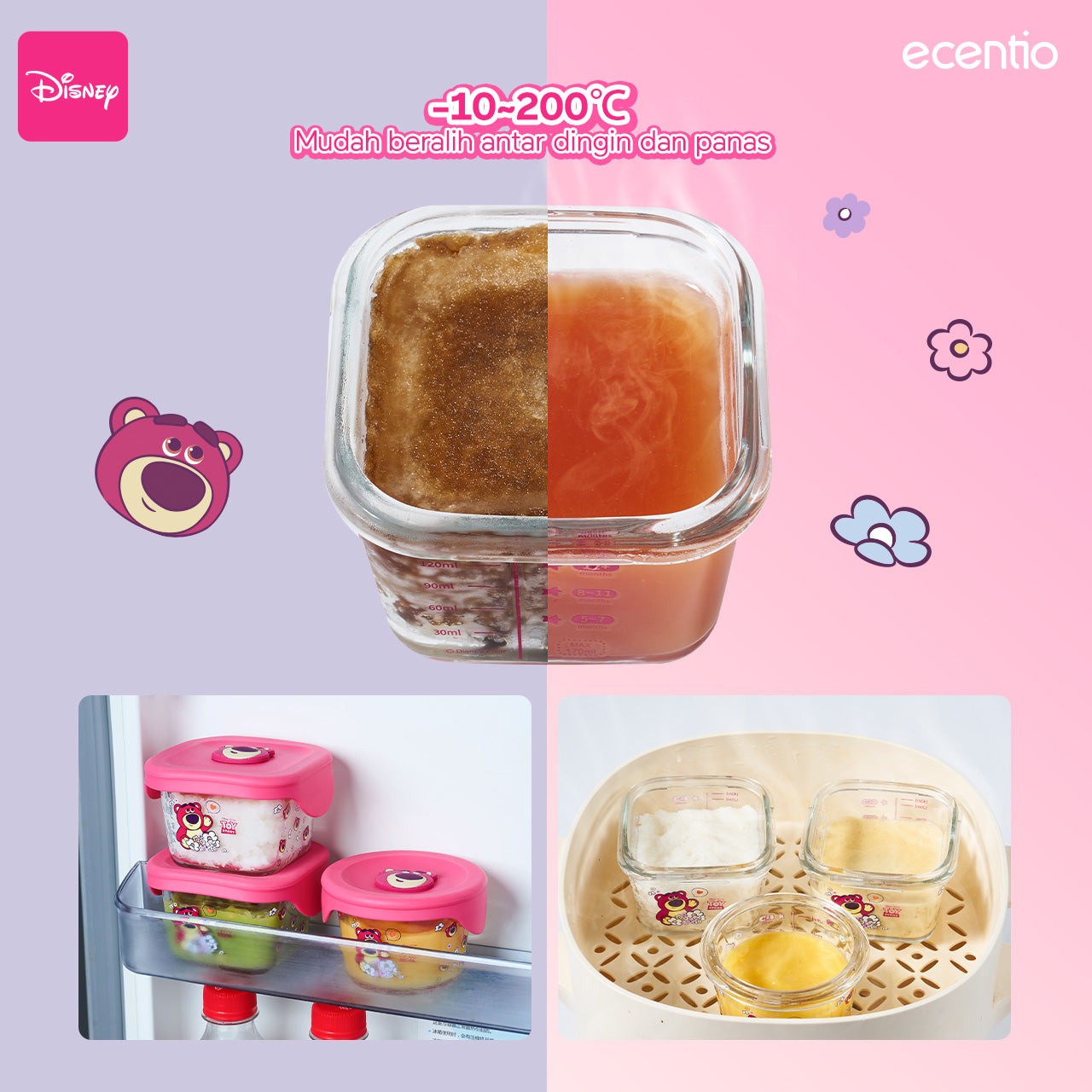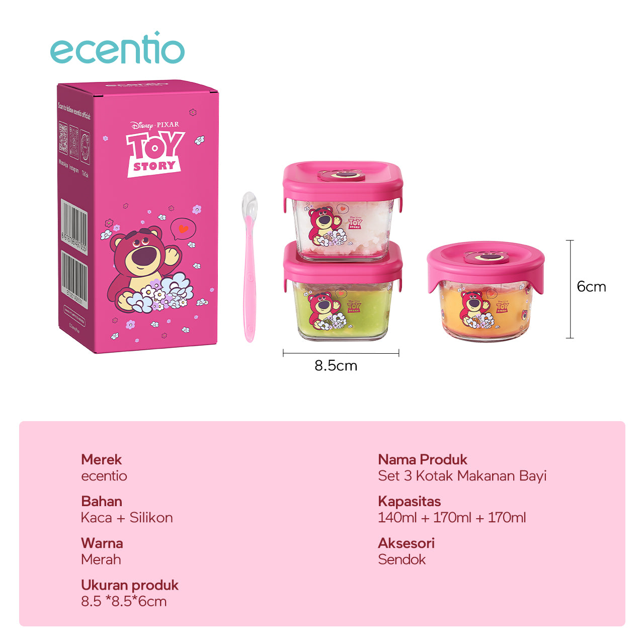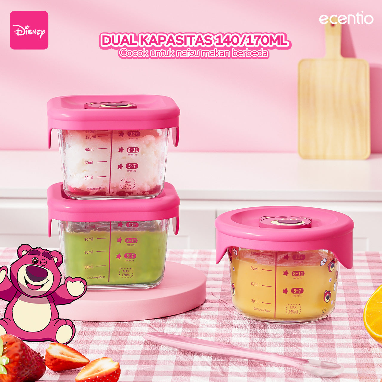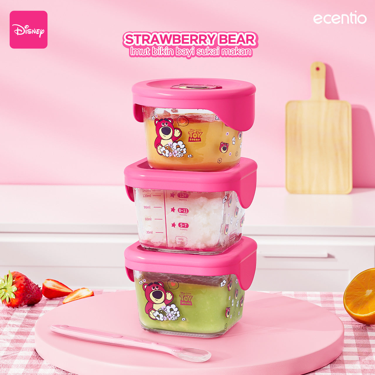 ecentio food container Kaca anak mpasi 3pcs set Disney lotso Mini Kotak Tempat Makan Glass free sendok silikon 120ml+140ml+140ml
