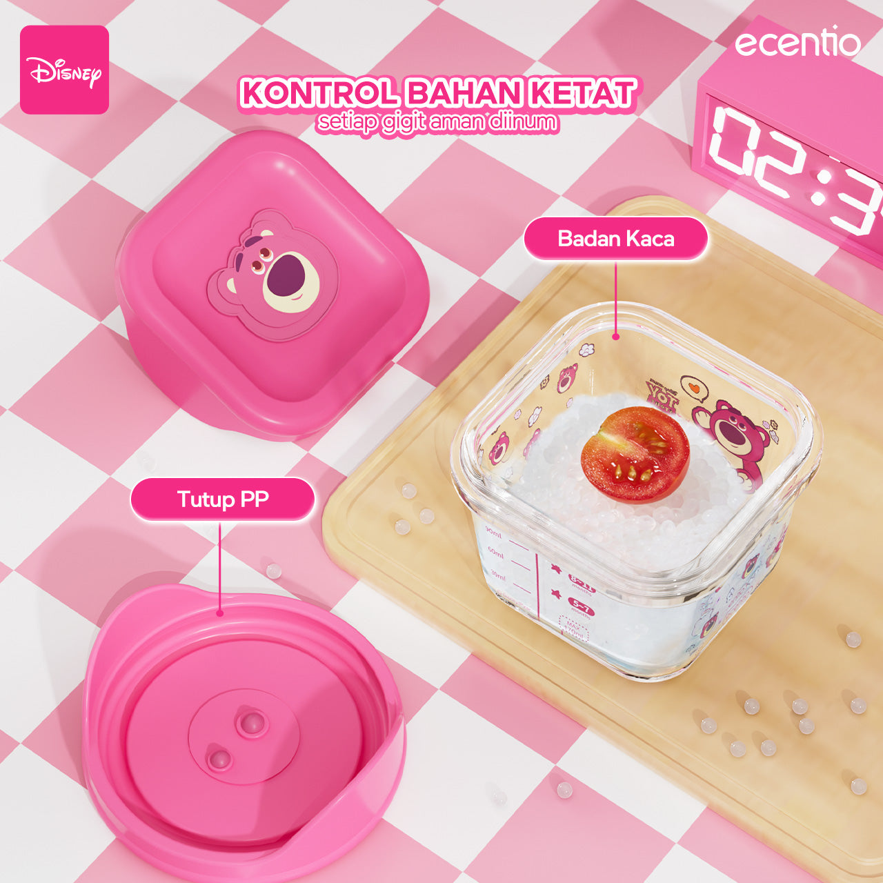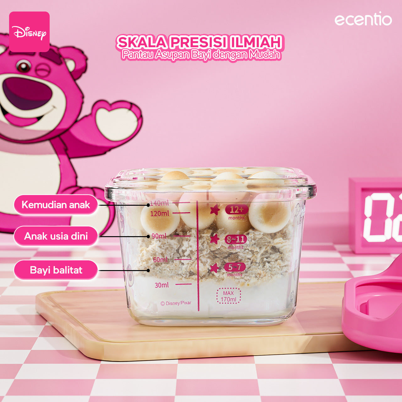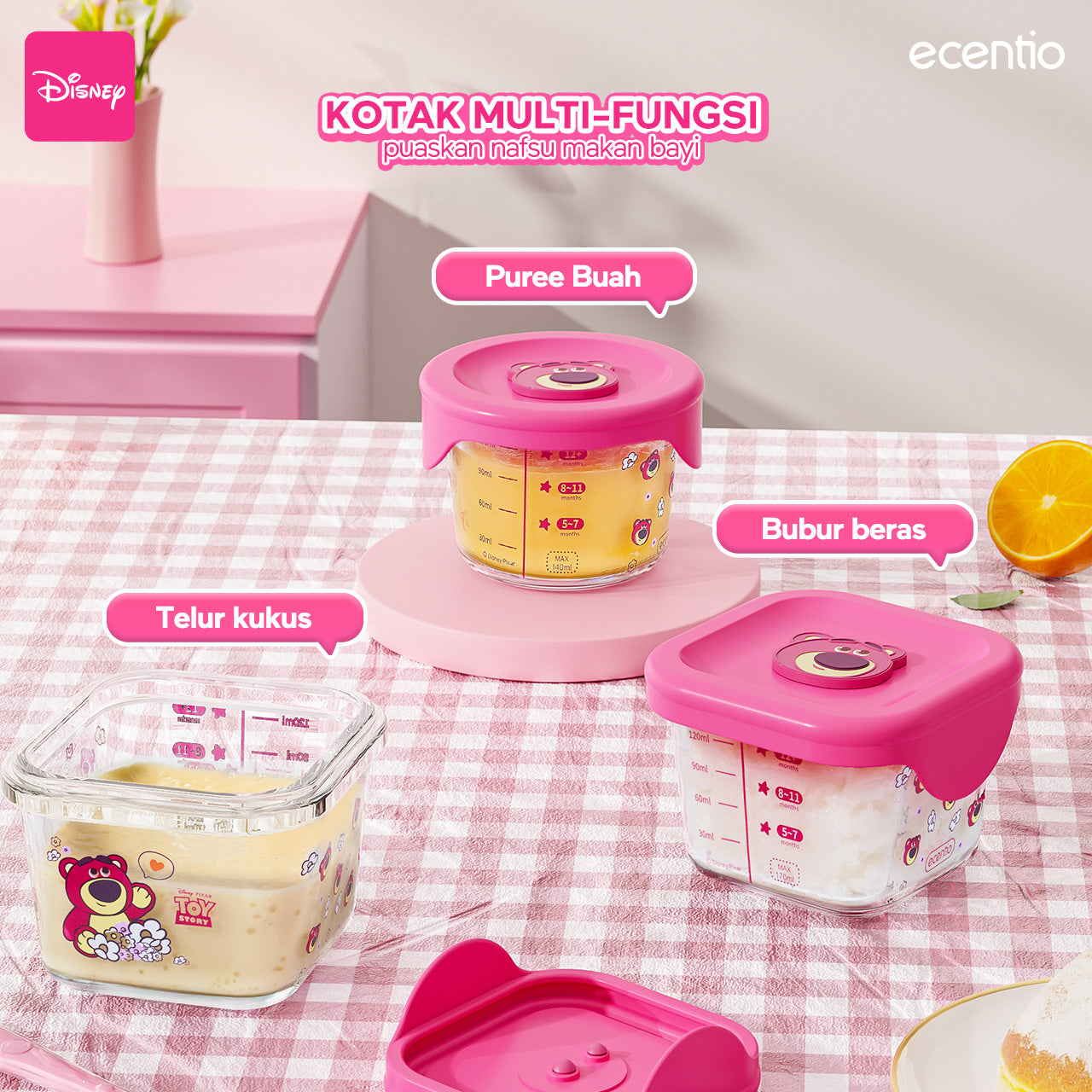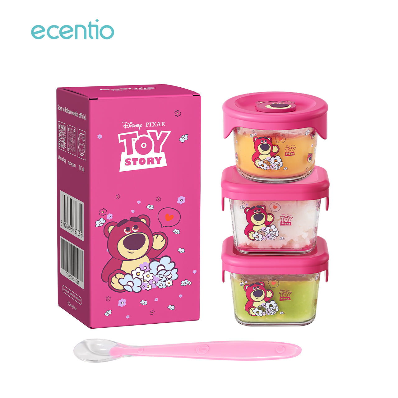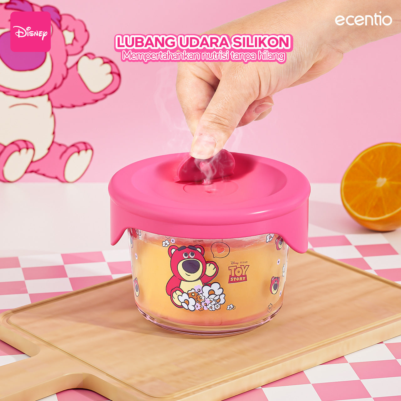 ecentio food container Kaca anak mpasi 3pcs set Disney lotso Mini Kotak Tempat Makan Glass free sendok silikon 120ml+140ml+140ml
