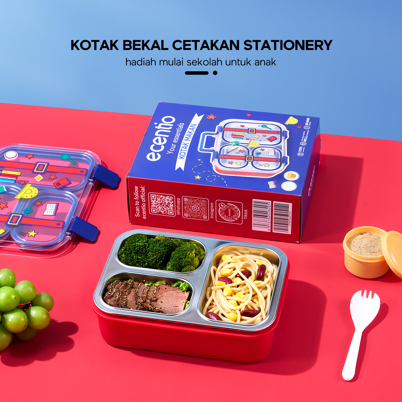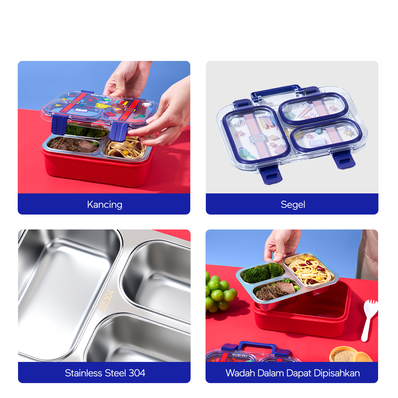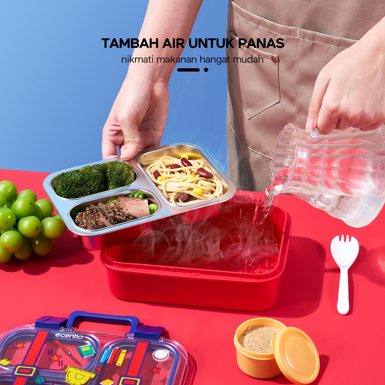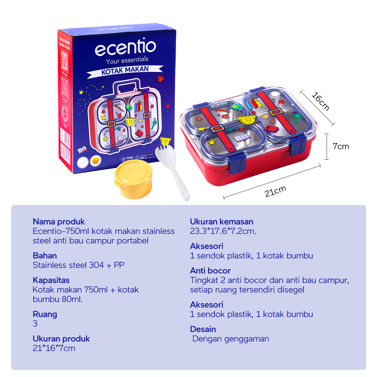 ecentio lunch box anak 750mml stainless 304 sekat 3 dan anti tumpah free sendok sumpit