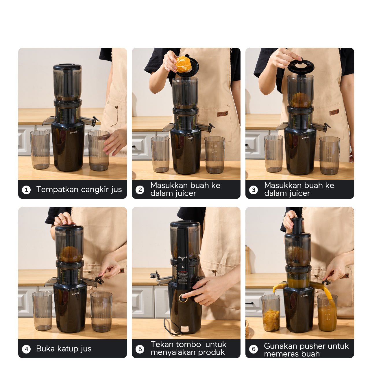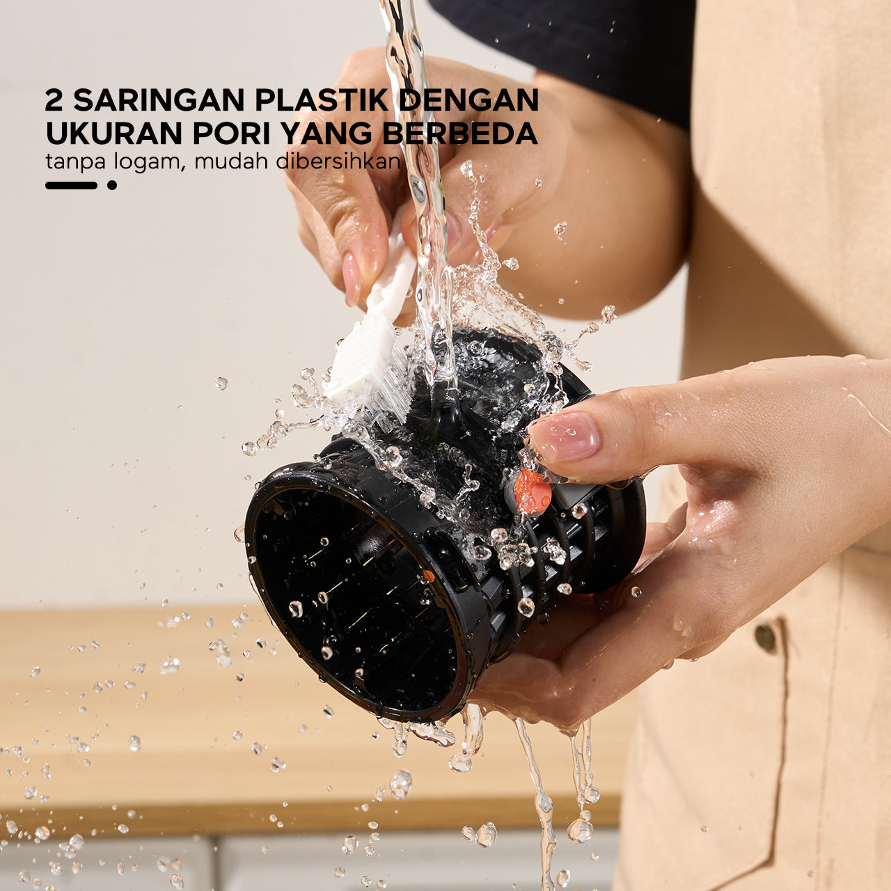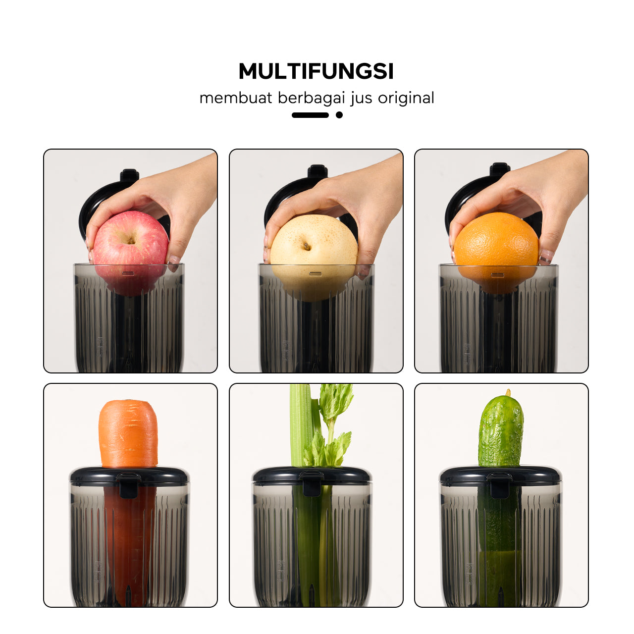 Daftar kemasan: Mesin jus original (termasuk: saringan lubang besar, saringan lubang kecil, sikat pembersih, gelas ampas, gelas jus, petunjuk penggunaan)