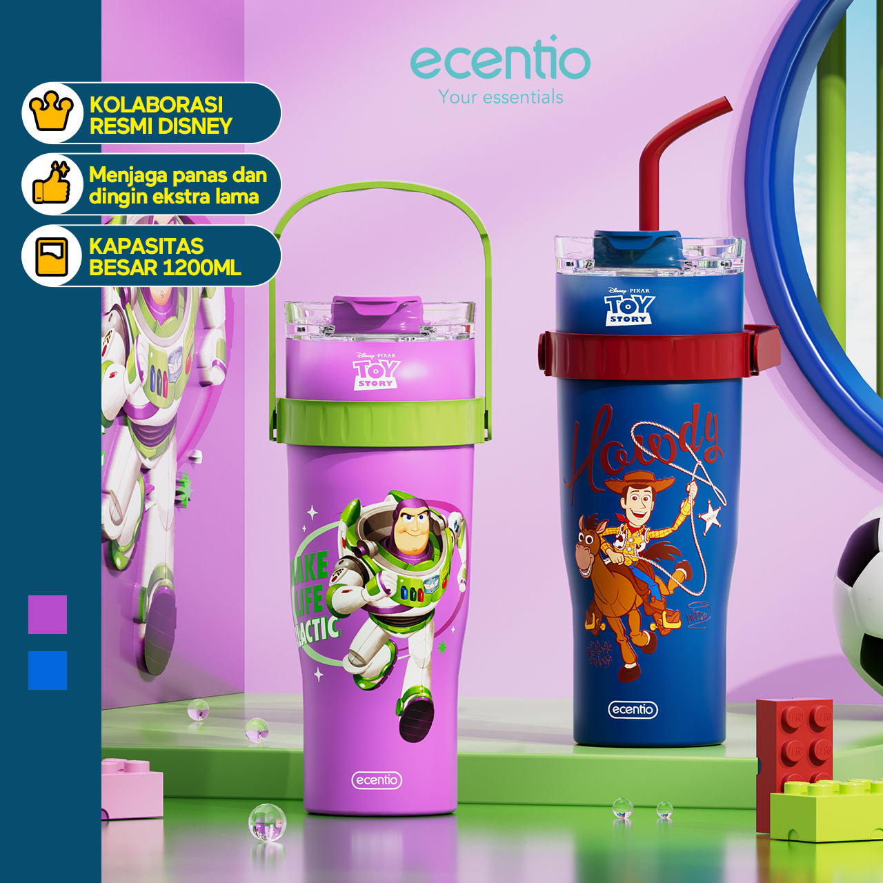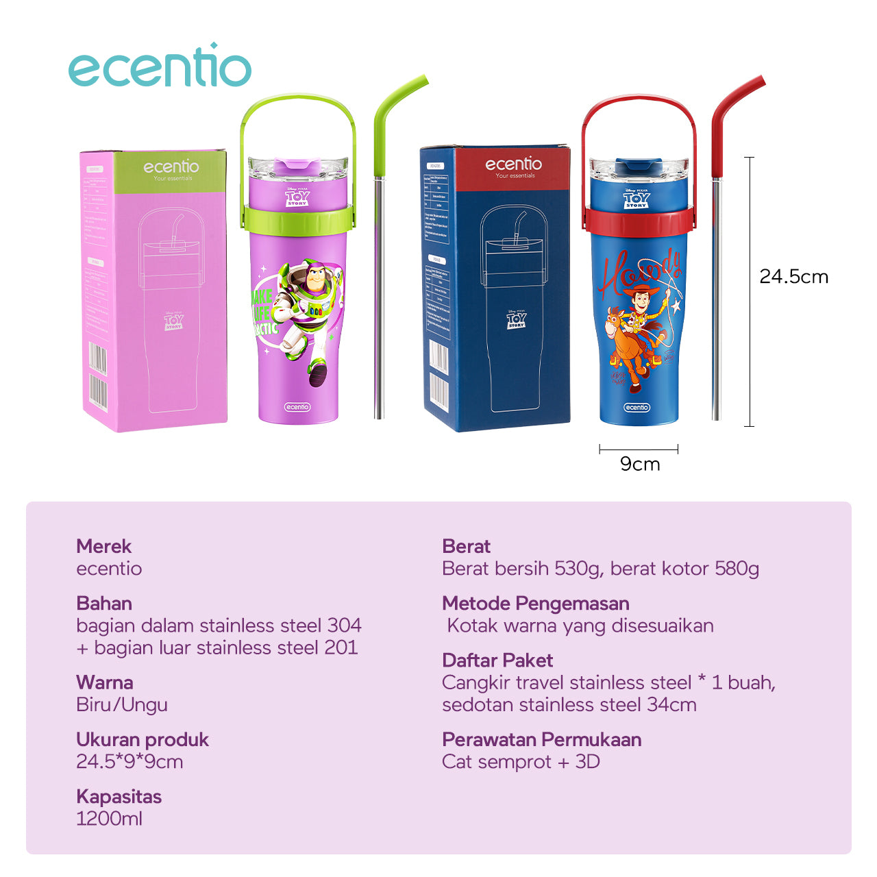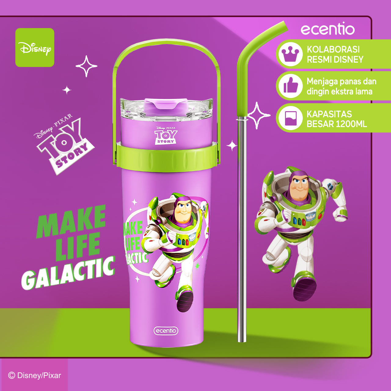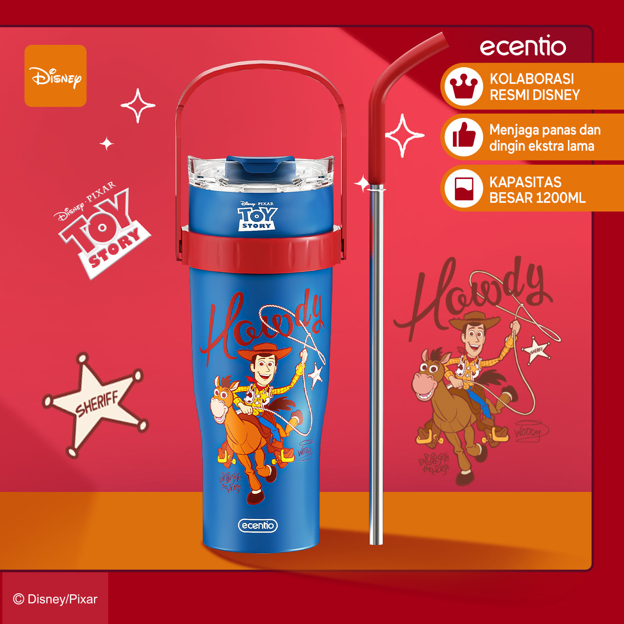 ecentio tumbler minum stainless 1.2L Disney Toy Story Woody & Buzz tahan dingin 24jam premium botol minum aesthetic besar
