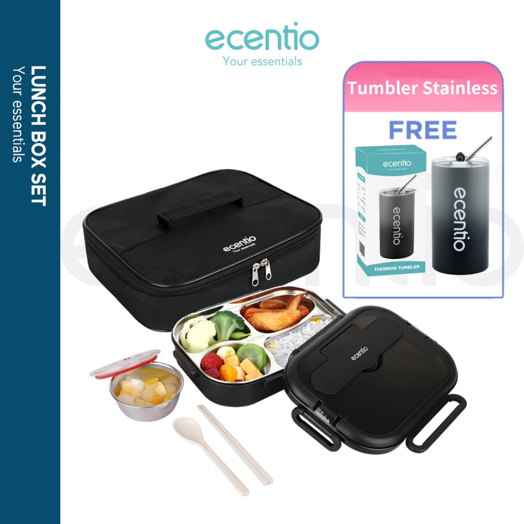 【Gratis Tumbler】ecentio lunch box stainless sekat 4 dan tempat minum anti tumpah tempat makan hitam