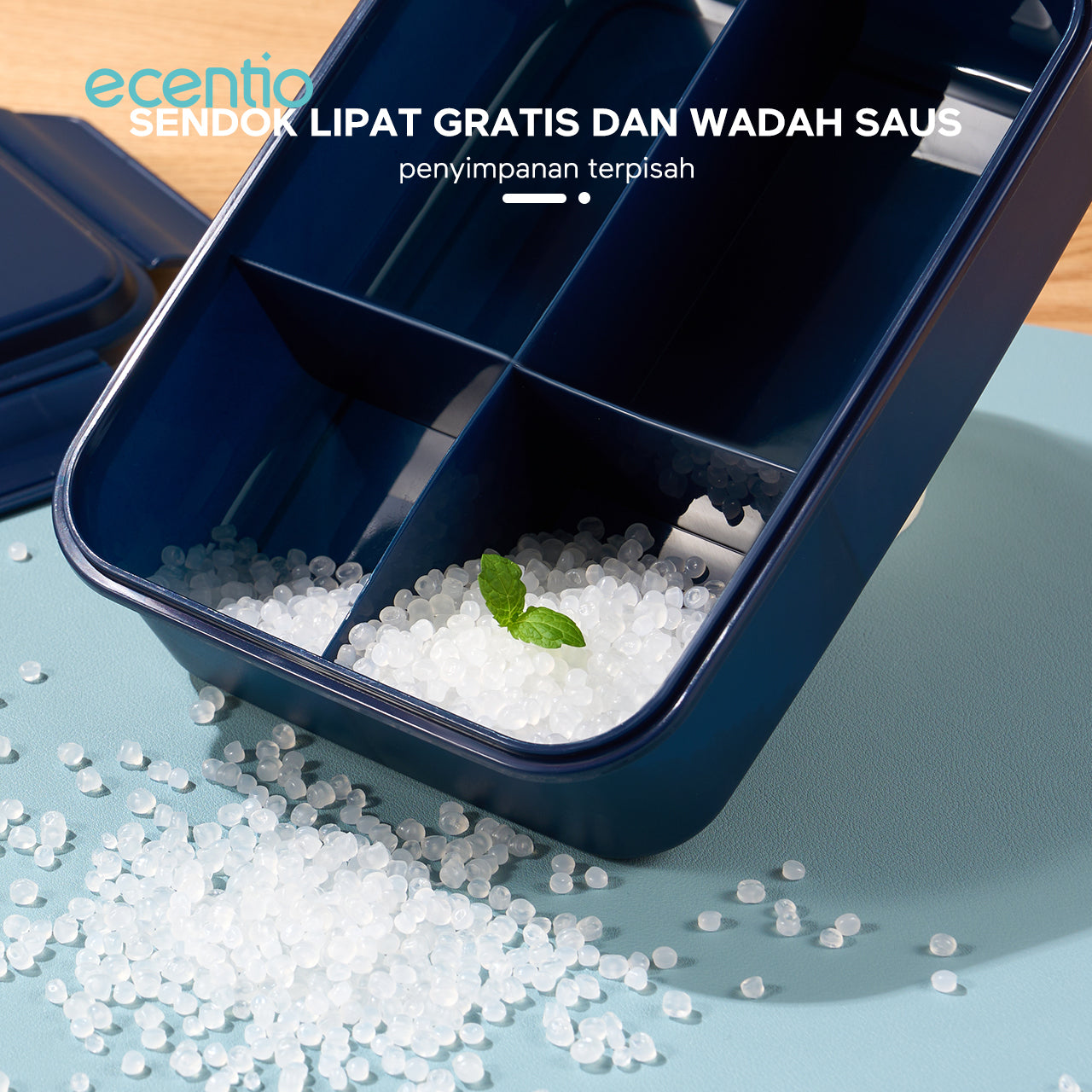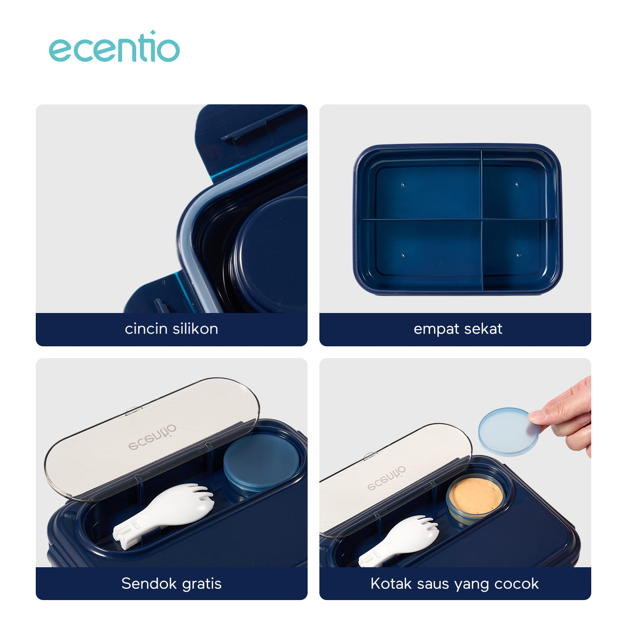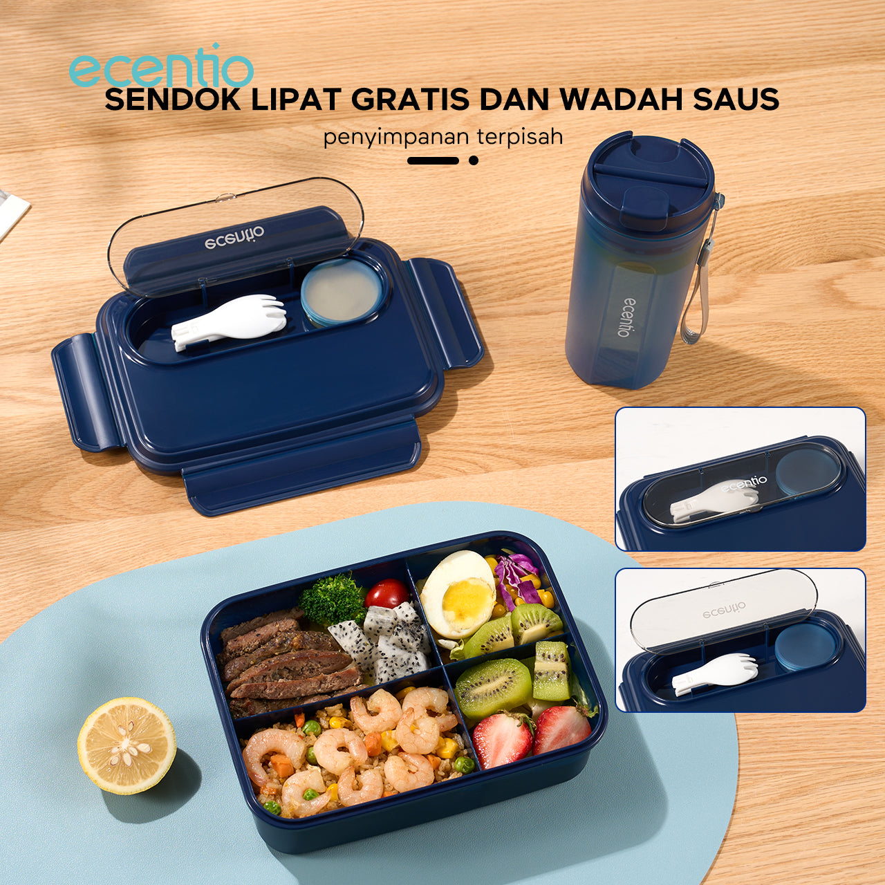 【New Launch】ecentio Kotak Bekal Makan Set 1200ml + 500ml sekat 4 dengan kotak saus&sendok BPA free lunch box set Gratis botol minum