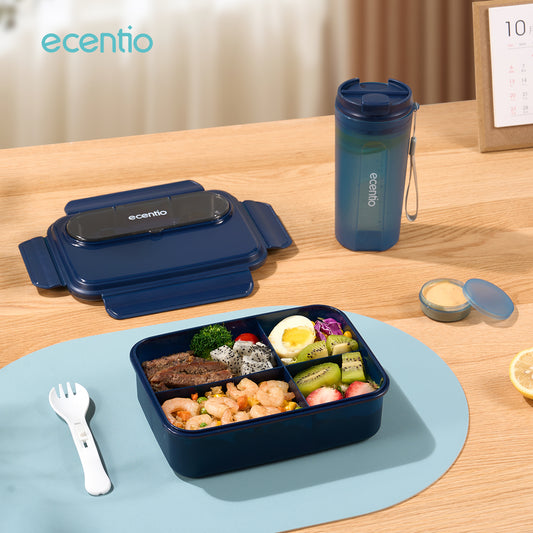 【New Launch】ecentio Kotak Bekal Makan Set 1200ml + 500ml sekat 4 dengan kotak saus&sendok BPA free lunch box set Gratis botol minum